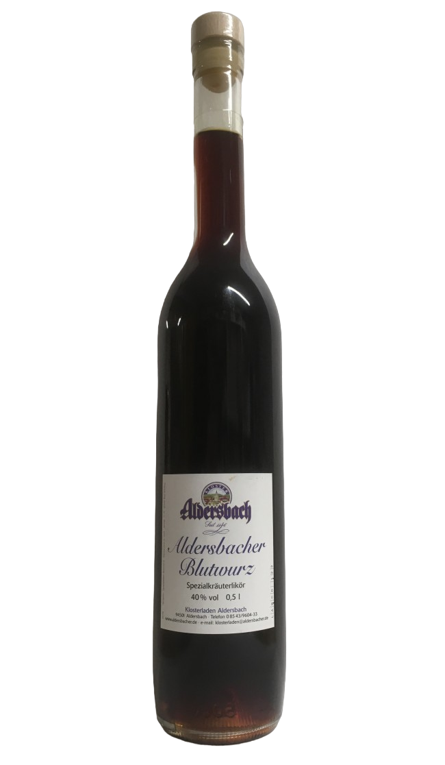 Aldersbacher Blutwurz 0,5l. Verpackt in einer hübschen, schlanken 0,5l Flasche. Ein wunderschönes Mitbringsl. 40 % vol.