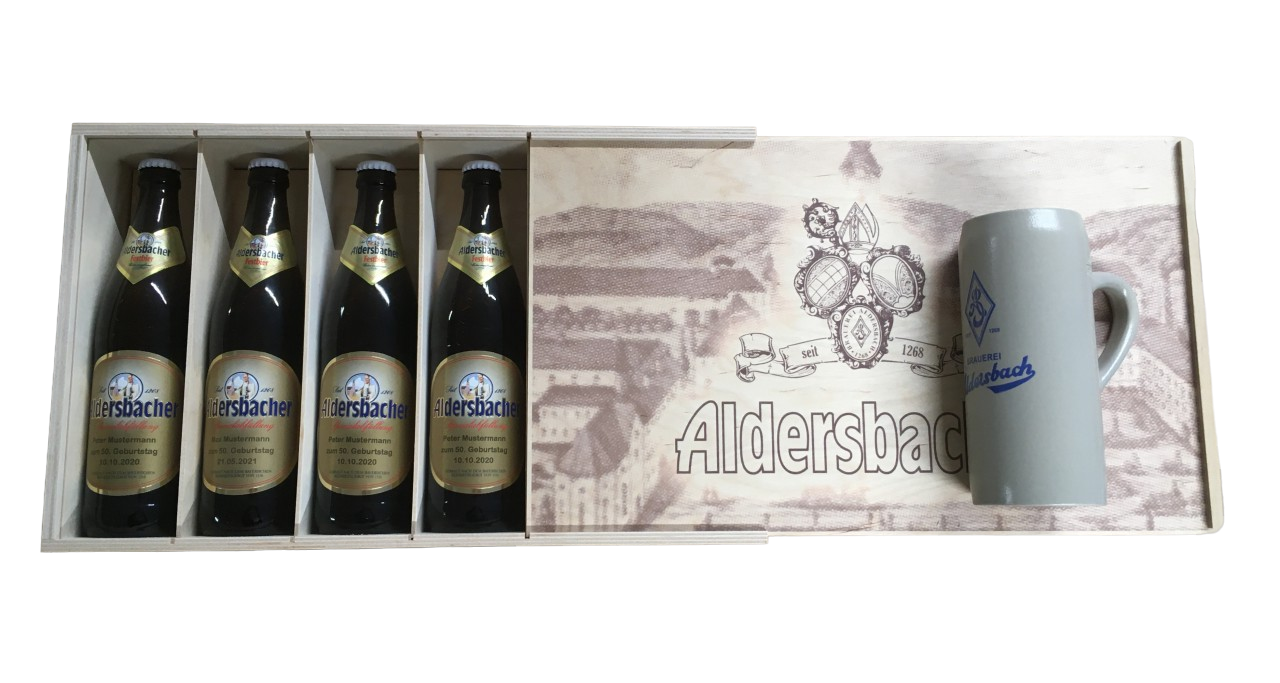 1 Steinkrug 0,5 l und 4 x 0,5 l Festbier mit persönlichem Etikett.