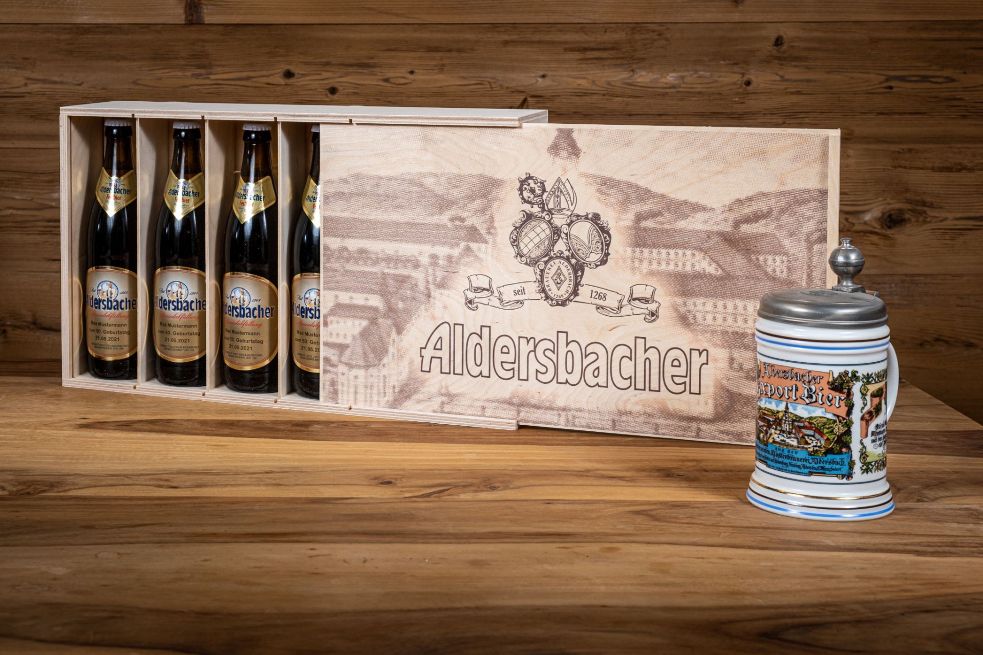 Porzellankrug "Export Bier" mit 4 Flaschen und persönlichem Etikett