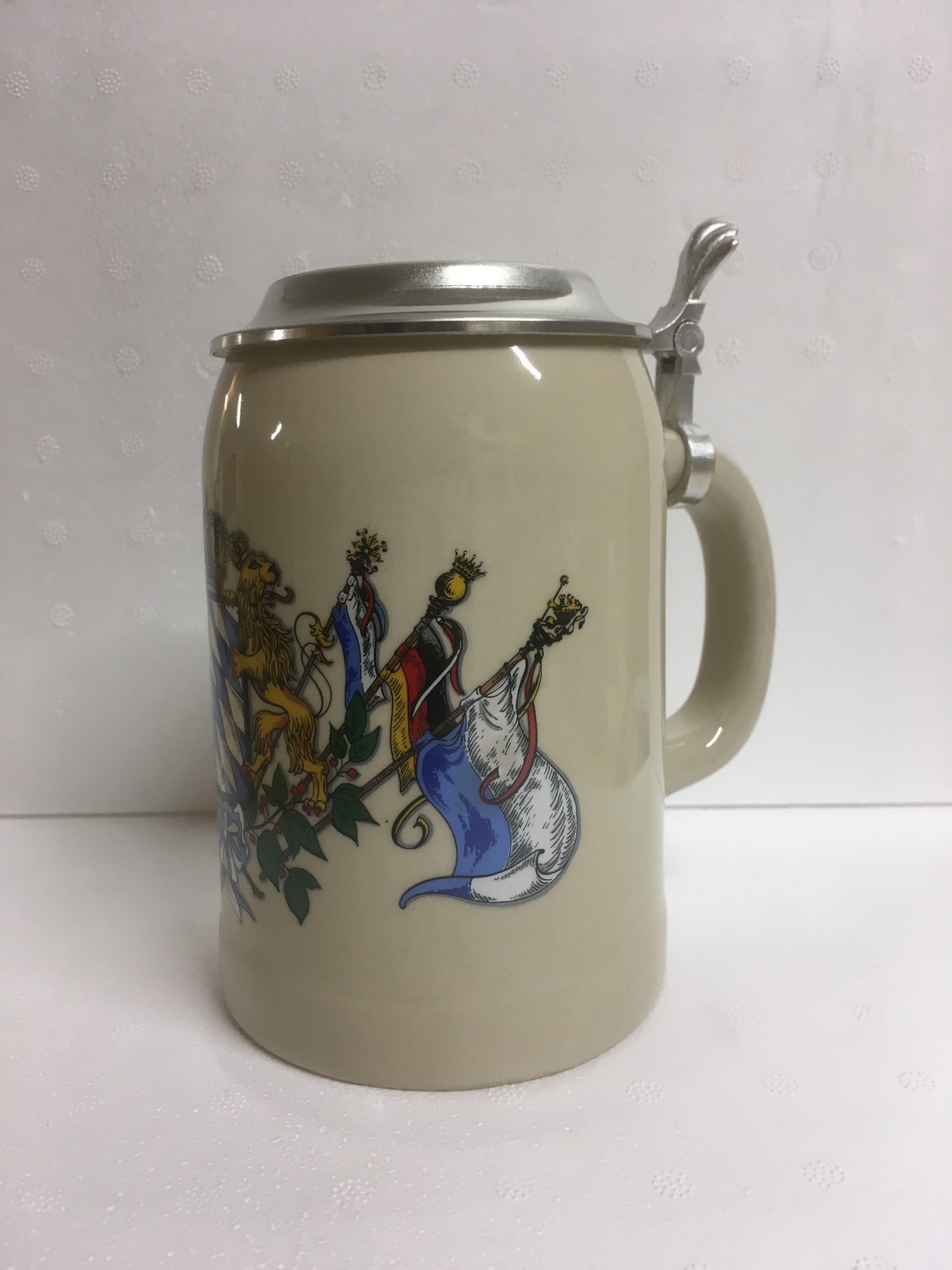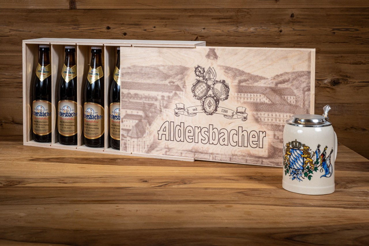 Steinkrug "Bayernfahne" mit Gravur und 4 Flaschen Festbier mit persönlichem Etikett