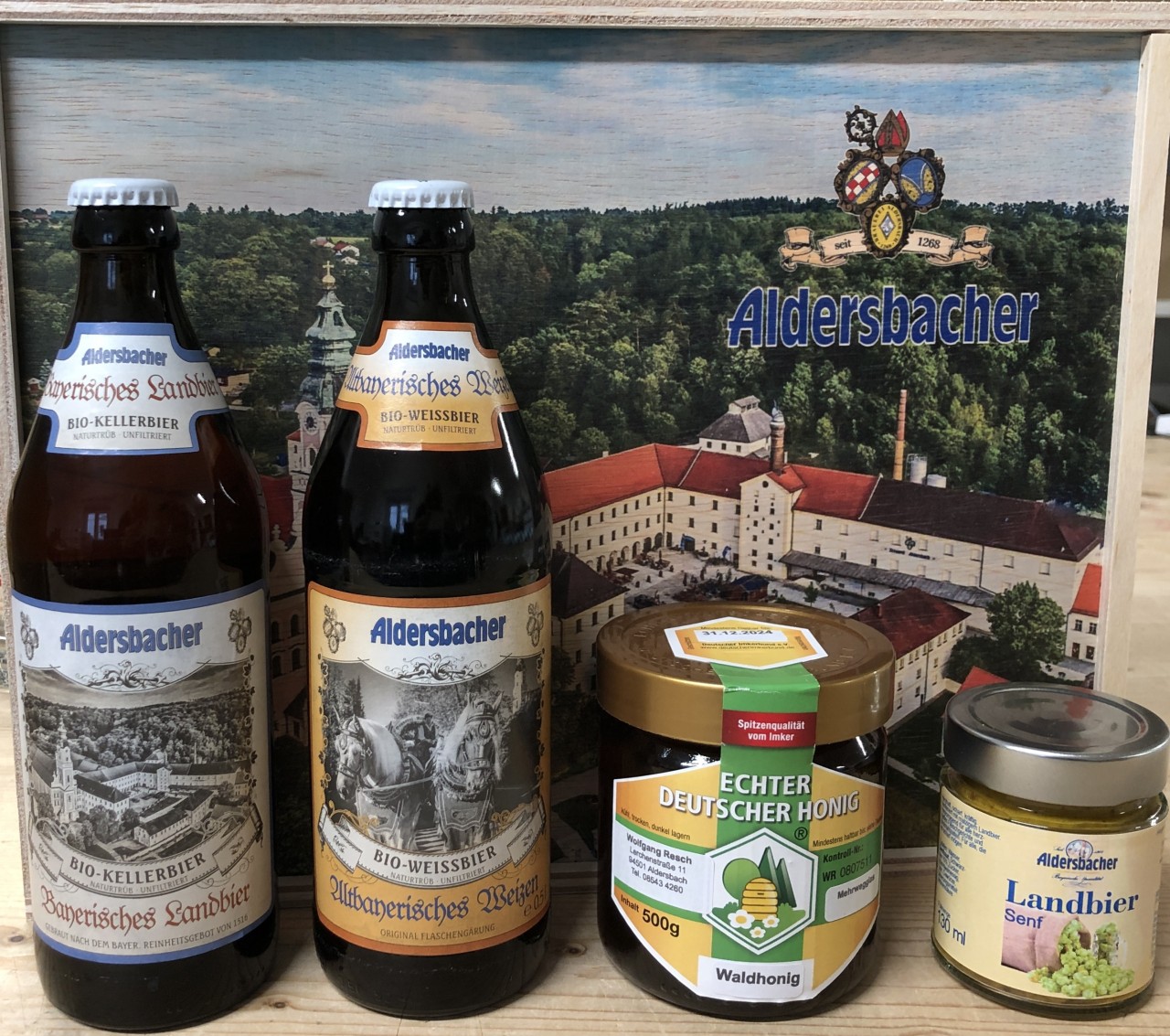 1 x Aldersbacher Landbiersenf 130 ml. Zutaten: Wasser, SENFSAAT, Schwarzbier 15 % Zucker, Branntweinessig, Salz, Gewürze, Säuerungsmittel: Zitronensäure